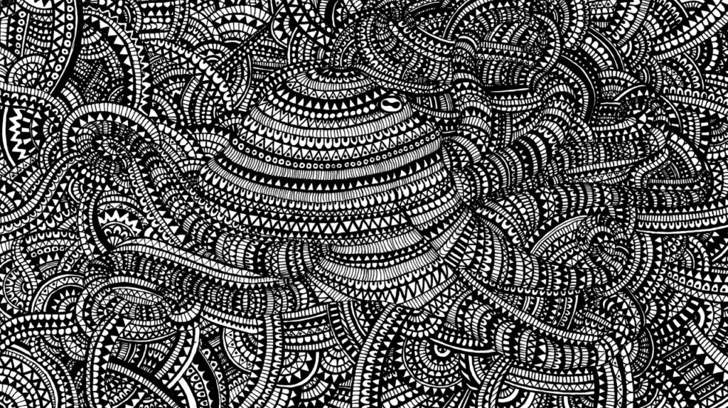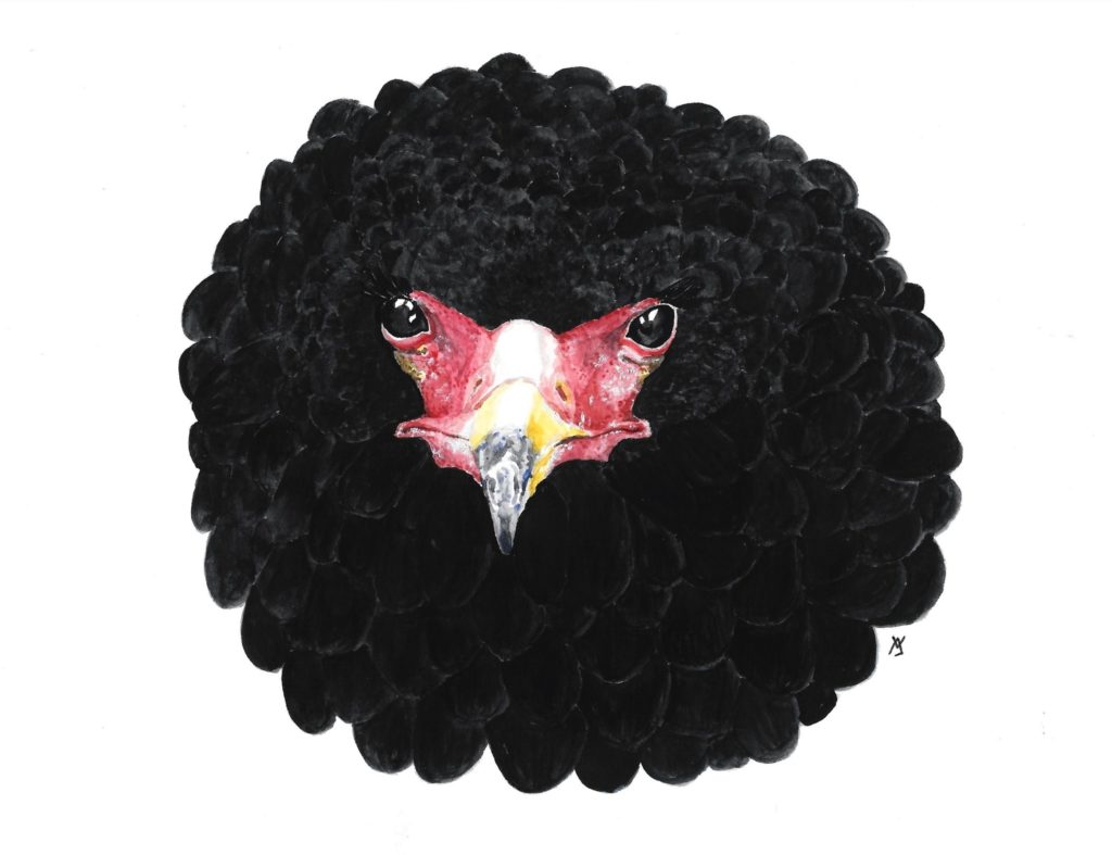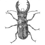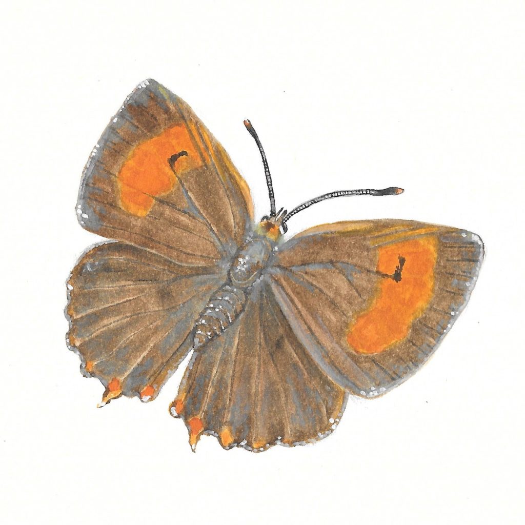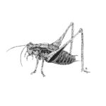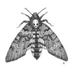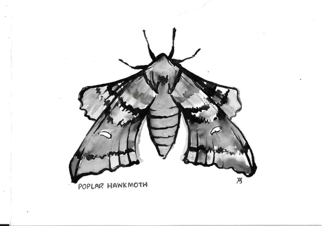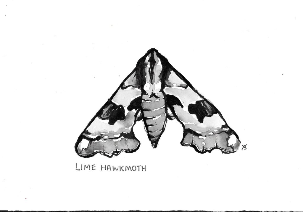 Broad-bordered bee hawk-moths – with caterpillar and eggs on Honeysuckle. Illustrated in ink and bleach.